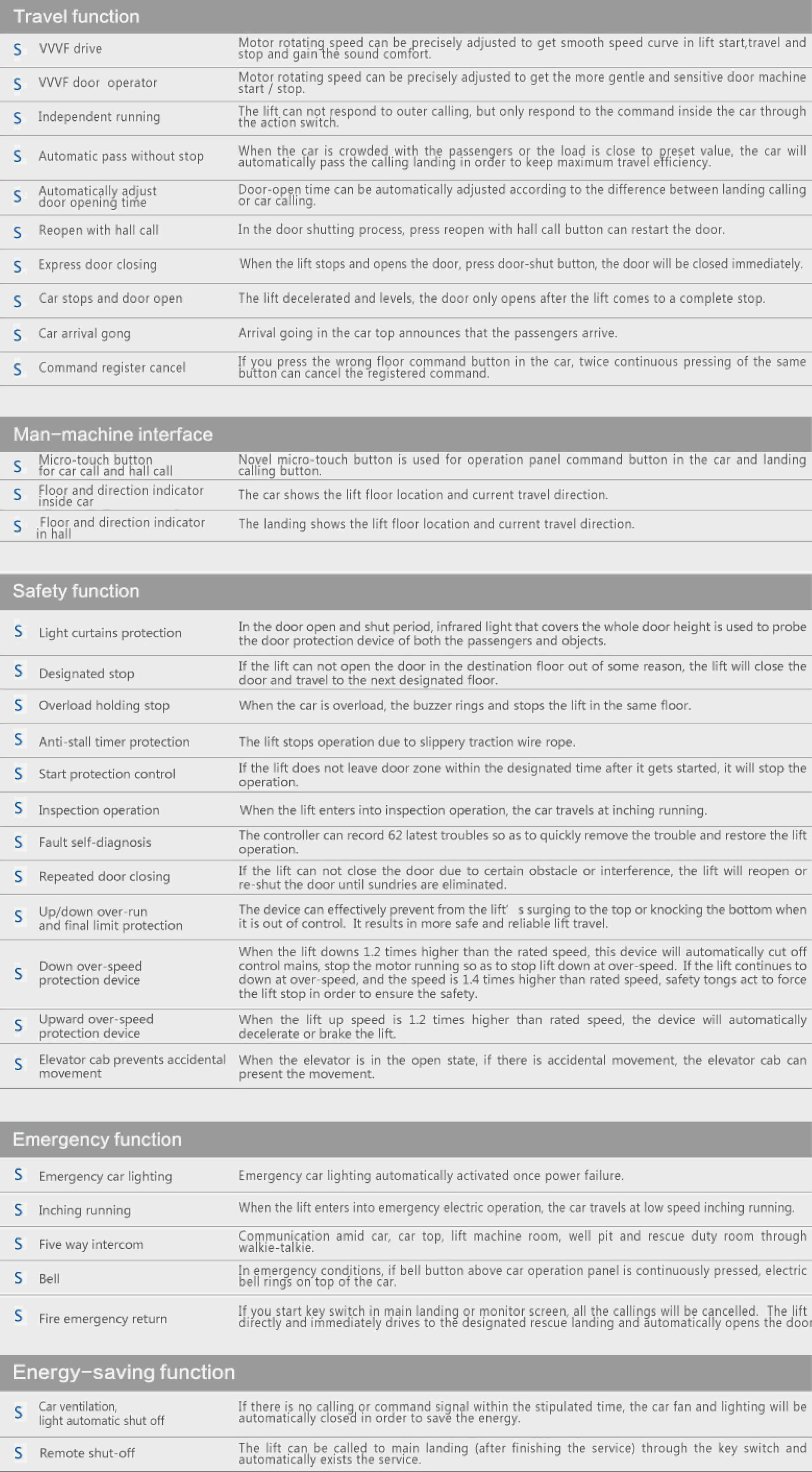 It applies dual control systems. It respectively collects elevators position information for data comparison. It executes accurate position correction to elevator position. It ensures the safer high speed elevator operation. Inner new style sealing technology prevents car from quickly rushing to top. It thus ensures the passengers'safety. Oxygen silicon compounds safety tongs superiorly resist heat and wear-ability. It further increases secure elevator operation.